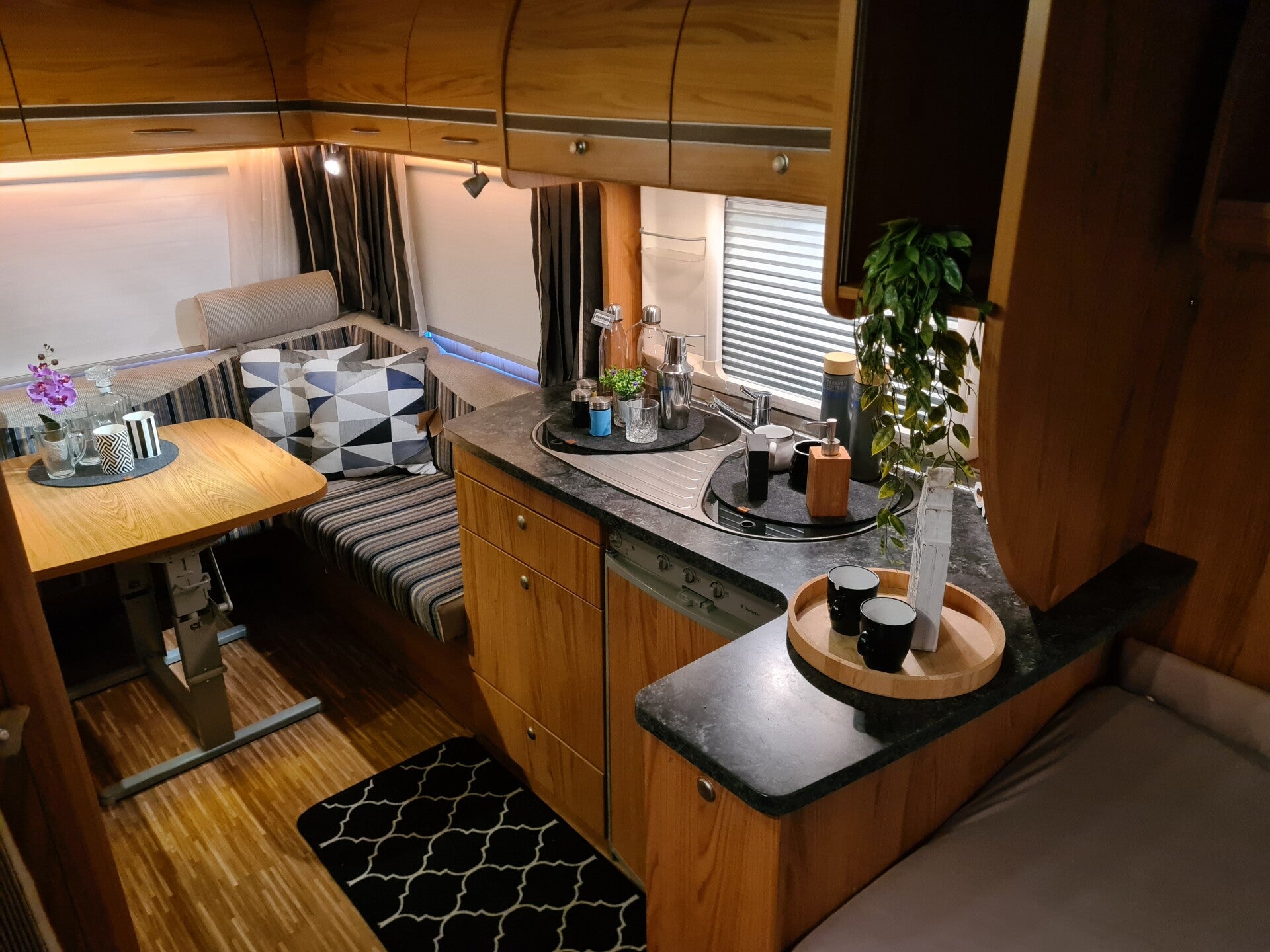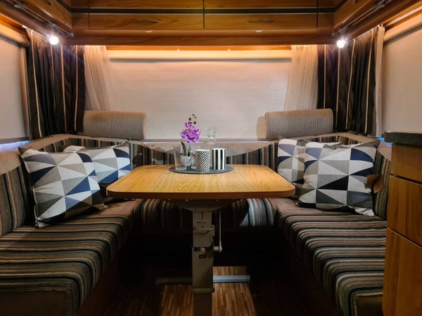 # ACHTER RUIME RONDZIT ... EIND VAN DE RONDZIT KUN JE DE KUSSENS VERWIJDEREN EN TAFEL DOORSCHUIVEN WAARDOOR NOG MEER RUIMTE ONTSTAAT !! ( ORIGINEEL AF FABRIEK )